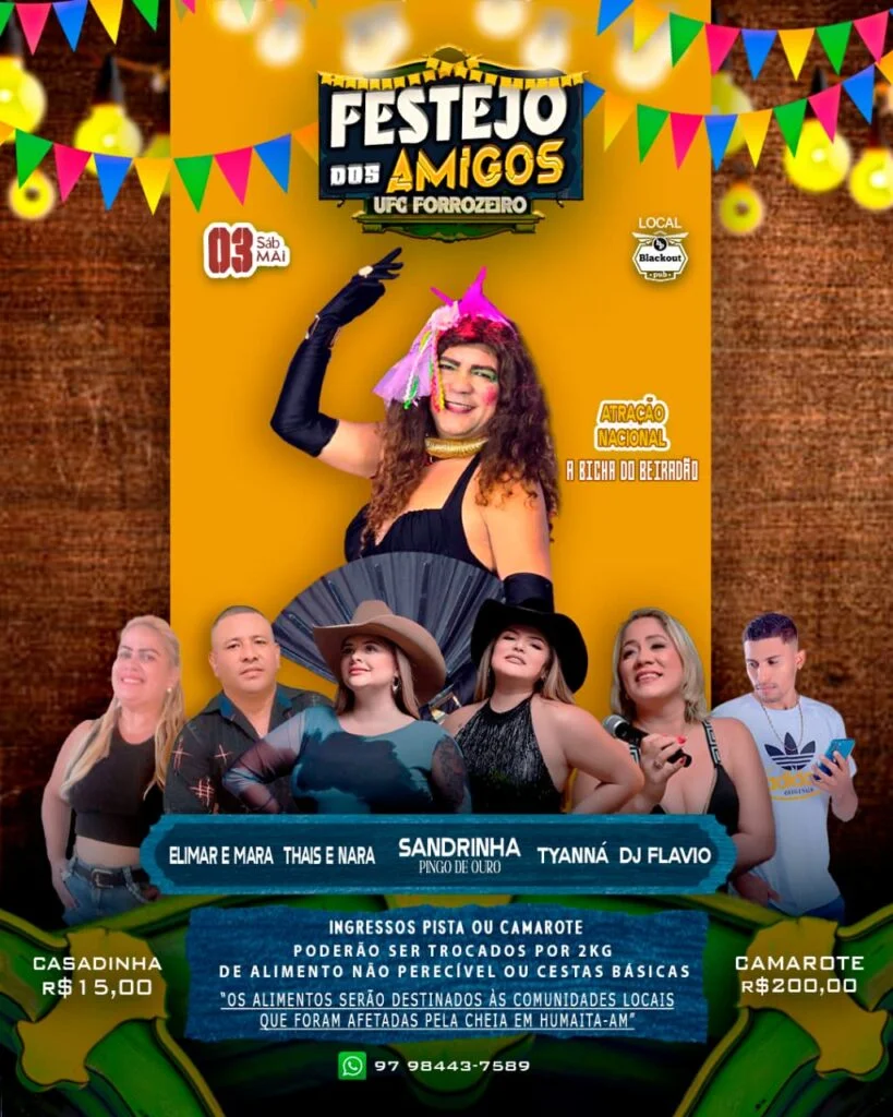 O evento acontecerá no sábado, 3 de maio, e reunirá música, diversão e a oportunidade de contribuir para uma boa causa. Os ingressos para o evento, tanto para pista quanto para camarote, poderão ser adquiridos mediante a doação de dois quilos de alimentos não perecíveis ou uma cesta básica. Todos os donativos serão destinados a ajudar as comunidades locais que sofreram com a enchente no Amazonas.